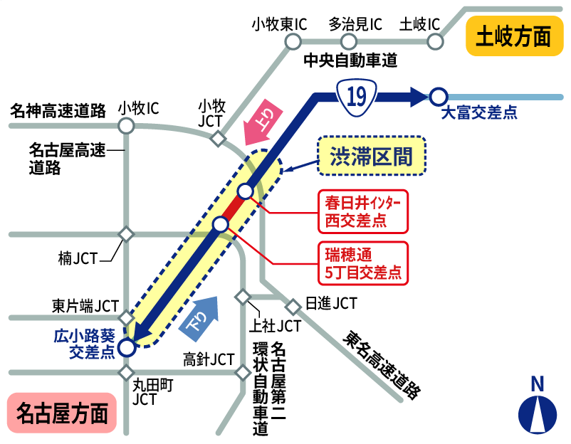 2022年度の、国道19号 名古屋市「広小路葵交差点」↔土岐市「大富交差点」の混雑状況です。