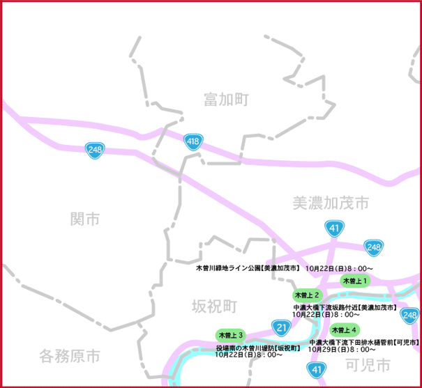 河川部トップ > 催し物の御案内 > 川と海のクリーン大作戦 > クリーン大作戦の実施概要マップ > 木曽川・長良川・揖斐川 > 木曽川・長良川・揖斐川4 富加町・関市・美濃加茂市・各務原市・坂祝町・可児市