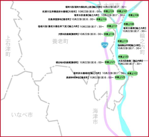 | 木曽上121 | 根古地水防倉庫 | 養老町 | 10月22日(日) | 8:00〜 |