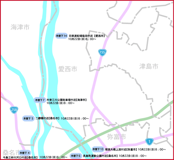 河川部トップ > 催し物の御案内 > 川と海のクリーン大作戦 > クリーン大作戦の実施概要マップ > 木曽川・長良川・揖斐川 > 木曽川・長良川・揖斐川12 海津市・愛西市・津島市・桑名市・弥富町・十四山村