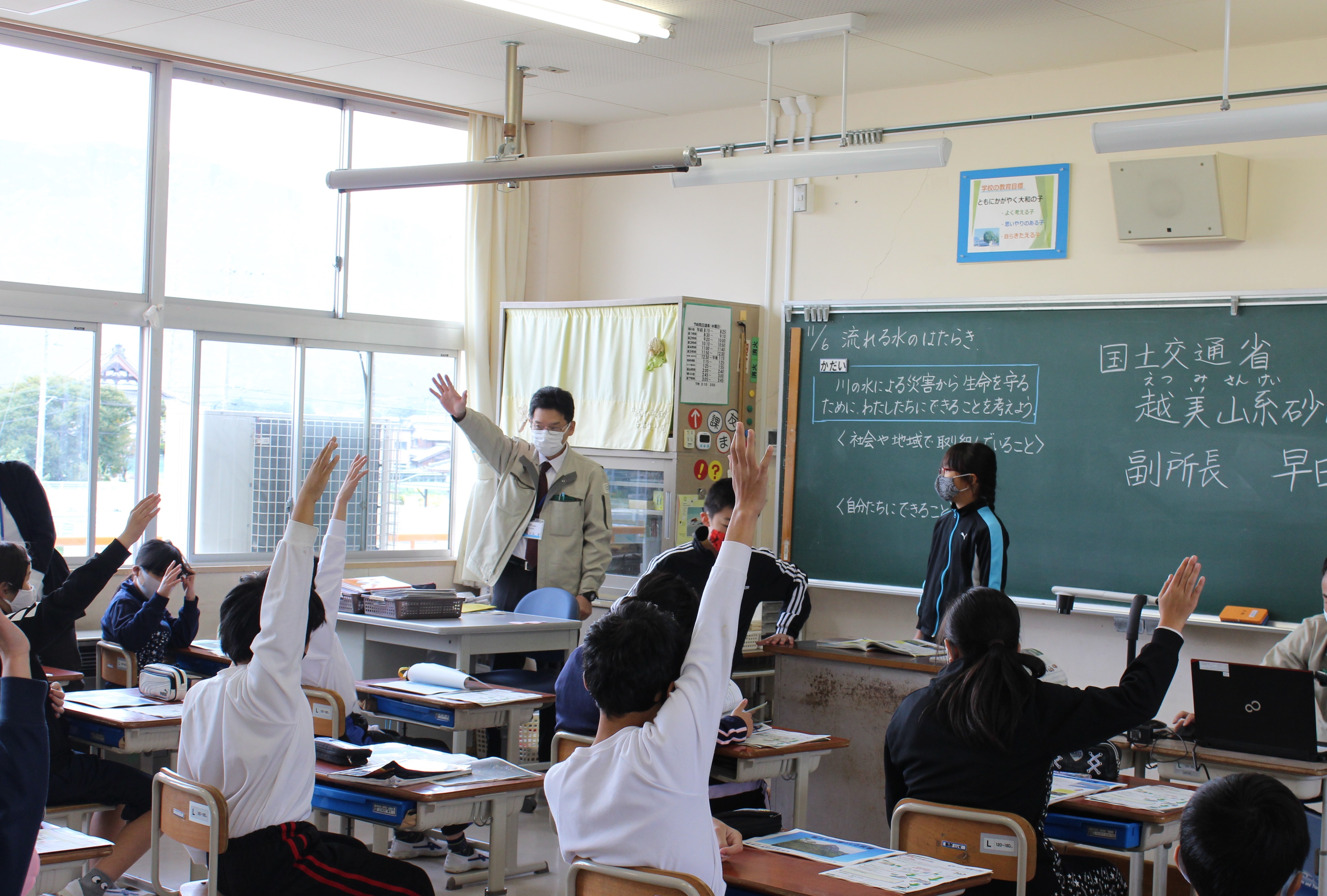 まず、「皆さんが住んでいるところはどんなところ?」と題して、大和小校歌の「西に山 ふもとに揖斐川が流れる 土地は広く稲作している」から読みとれる地形の特性として扇状地であること、地名の由来、ハザードマップでの危険箇所などを説明しました。また、揖斐川町は全国平均年間降水量の約2倍の降水量がある地域であり、降水量による危険度や早めの避難の大切さを説明しました。