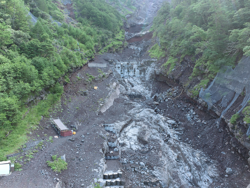 富士山源頭部、標高2,100m付近の大沢崩れで発生する崩壊および土砂生産抑制対策として、