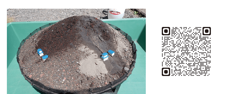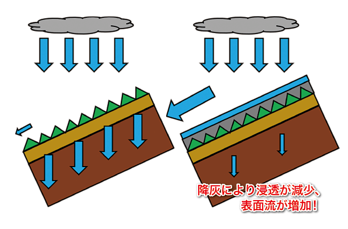 ~少量の雨でも発生する危険がある土石流災害~普段は地中に浸透する雨ですが、火山灰が土壌に降り積もると、目詰まりを起こして、水が浸透しにくくなる場合があります。その結果、表面流が発生して、水が集まりやすくなるので土石流が発生しやすくなります。 ![]() 降灰後土石流の実験(動画はQRコードから) | ![]() 通常時(左)と降灰後(右) |