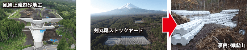 富士砂防事務所では、降灰後土石流などへの対策として、遊砂地・沈砂地等の砂防施設を整備したり、仮設堰堤のためのブロックを備蓄しています。