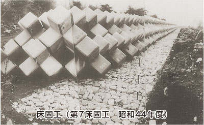 して下流に土砂災害をもたらさないよう、大沢扇状地で土石流を捕捉するための床固工の整備(第6、第7床固工)から開始されました。翌昭和45年には、富