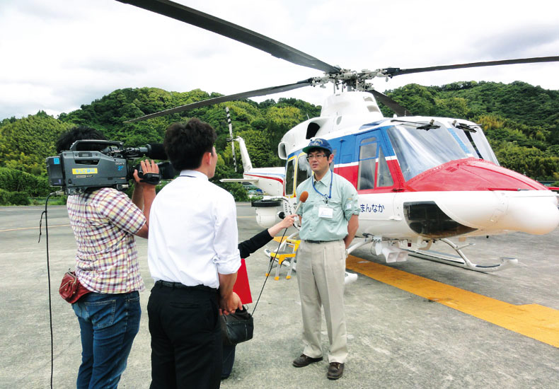 由比地すべり対策箇所をまんなか号で上空から点検しテレビ静岡からの取材に応じる吉田事務所長 |