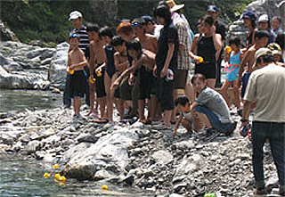 ![]() アヒルレース、スタート。追いかけて川原を走る元気な子も。 | |