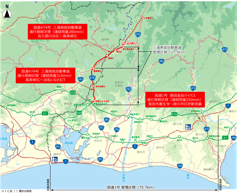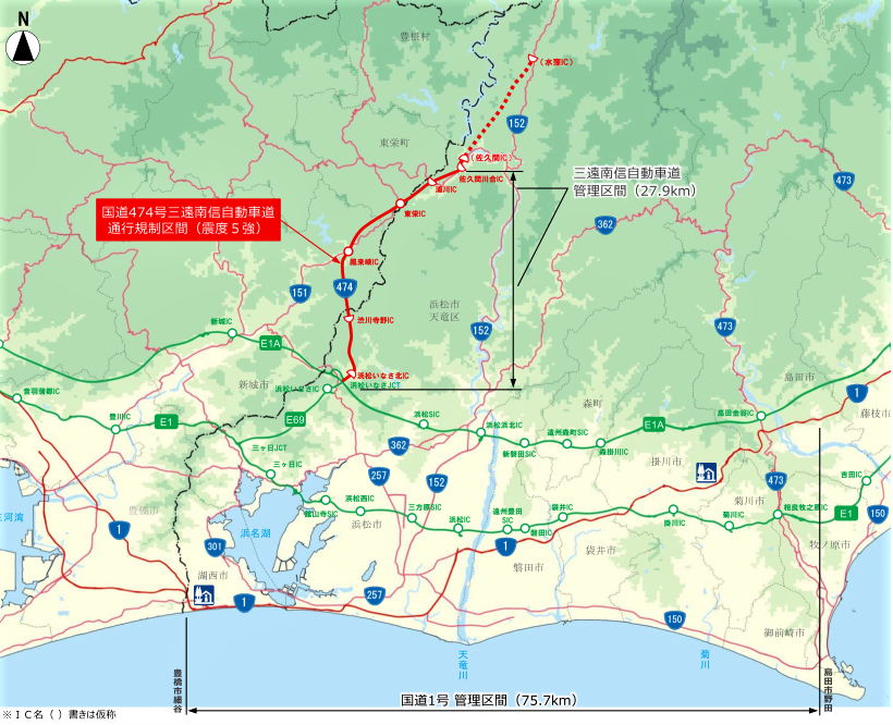 - 国道474号三遠南信自動車道では、震度5強以上で通行止めを行い、道路の点検を行います。