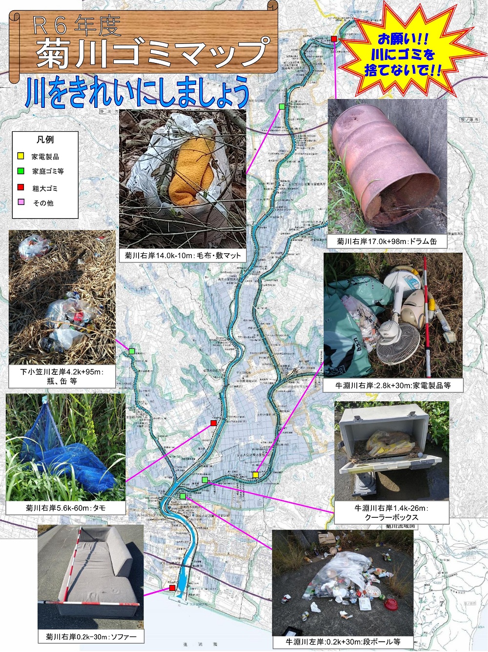 - 捨てられているゴミ:古タイヤや電化製品等の粗大ゴミ、河川敷でバーベキューを行った後のゴミや家庭で出る一般ゴミが非常に多いです。