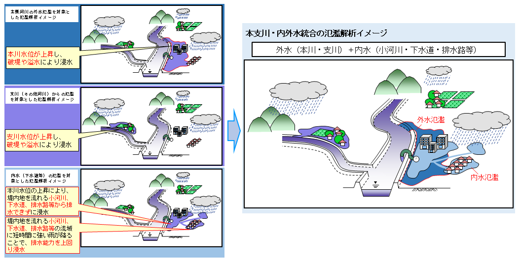 すでに検討されている「多段階の浸水想定図と水害リスクマップ」は国管理河川からの外水氾濫のみを対象としていました。
