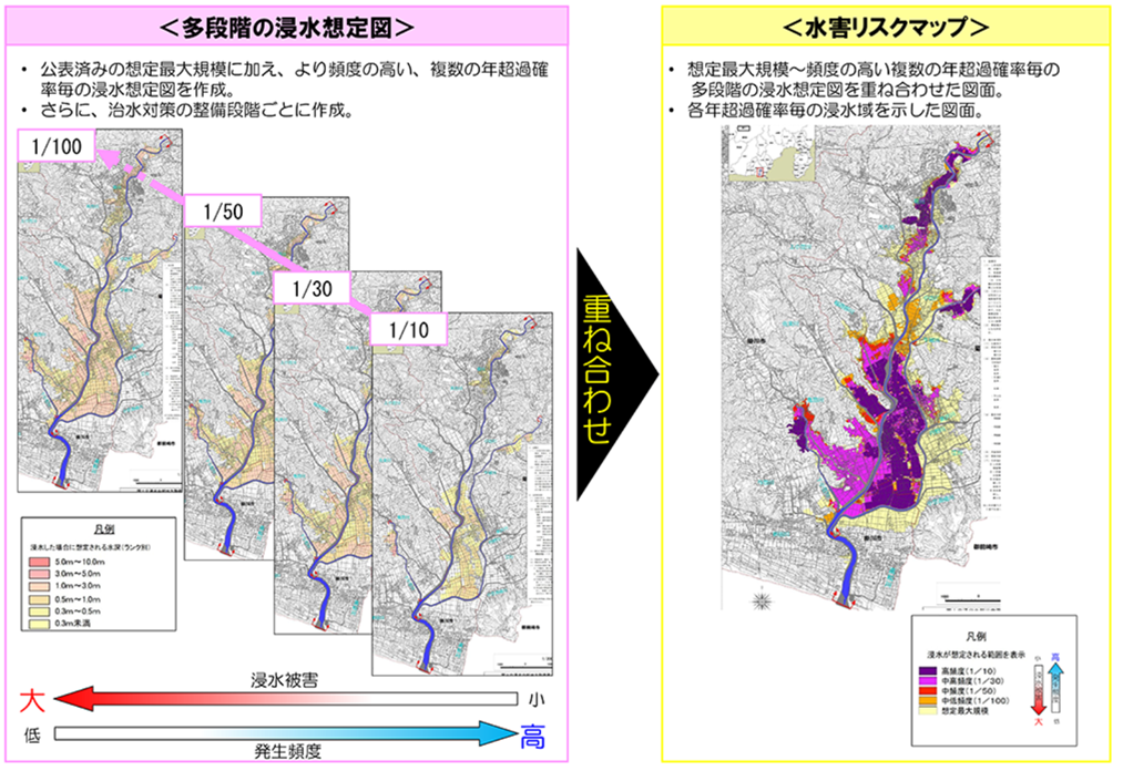国土交通省では、「洪水浸水想定区域図」のほか、土地利用や住まい方の工夫の検討及び水災害リスクを踏まえた防災まちづくりの検討など、流域治水の取組を推進することを目的として、発生頻度が高い降雨規模の場合に想定される浸水範囲や浸水深を明らかにするため、「多段階の浸水想定図と水害リスクマップ」を作成・公表することとしました。