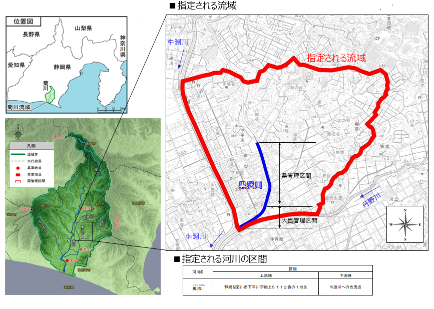 流域治水の本格的な実践に向けて、国土交通大臣は、令和3年11月1日に全面施行された流域治水関連法の中枢をなす特定都市河川浸水被害対策法第3条第1項等の規定に基づき、令和7年3月31日に、一級河川菊川水系黒沢川について、特定都市河川として指定しました。