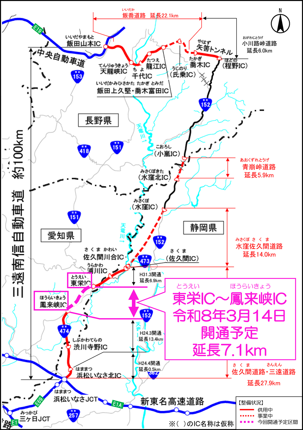 今回の開通により、三遠南信自動車道(約100km)のうち、佐久間道路・三遠道路(約27.9km)が全線開通となります。
