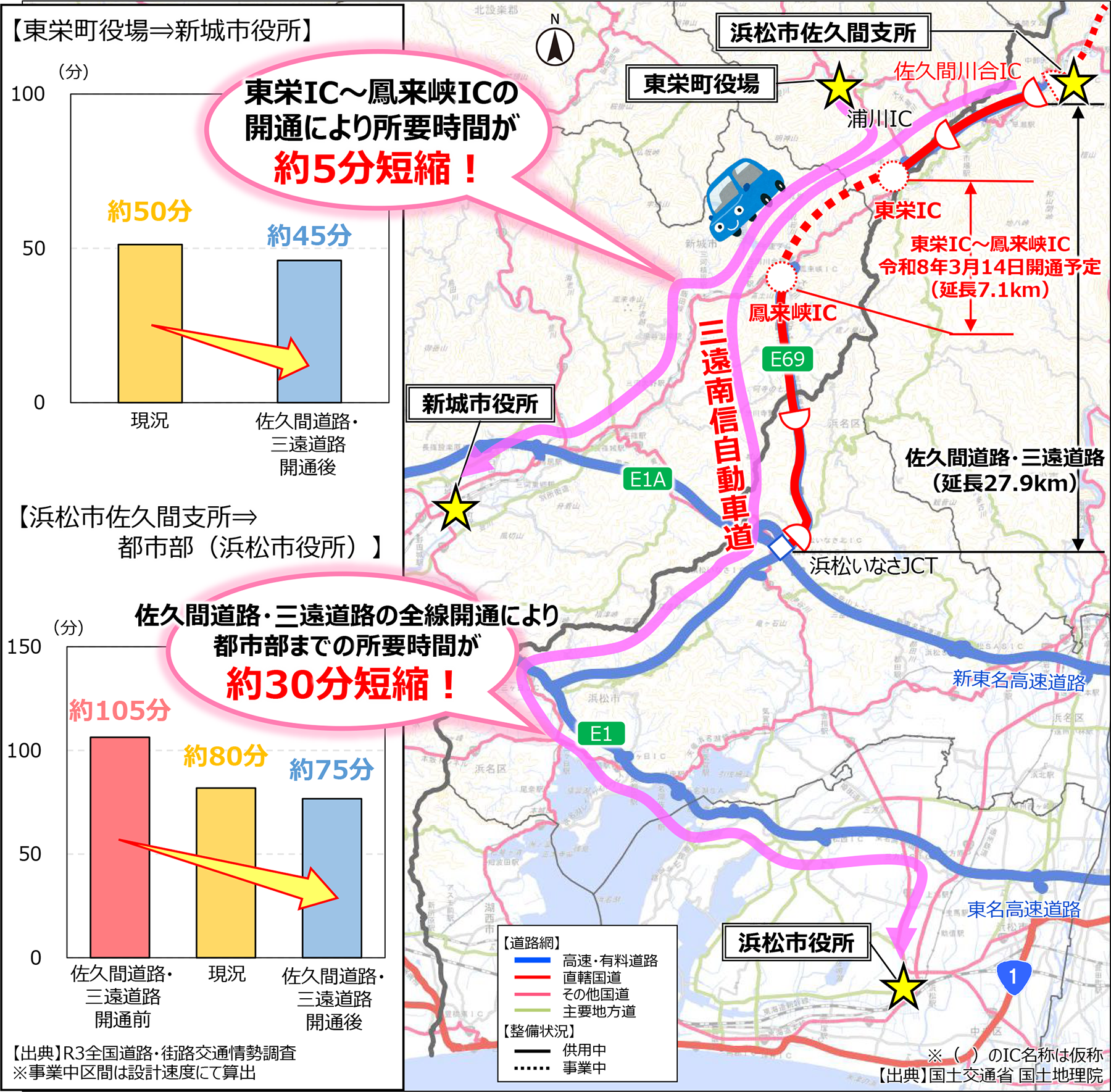 - 佐久間道路・三遠道路の全線開通により、奥三河地域から浜松市街地までのアクセス時間が短縮し、生活利便性の向上に寄与。