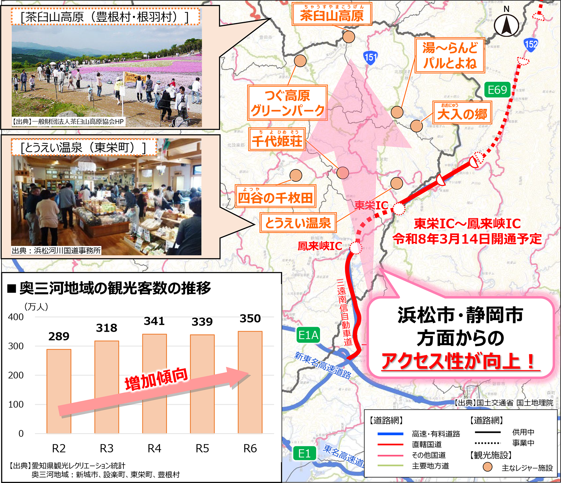 - 東栄IC~鳳来峡IC間が開通することで、観光・レジャー施設へのアクセス性が向上し、奥三河地域周辺の観光活性化に寄与。