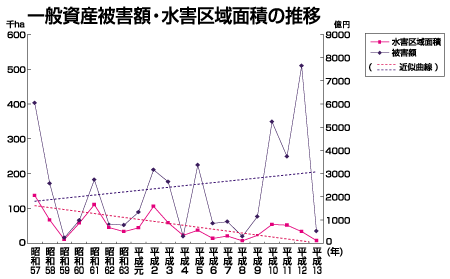 農地の減少等、都市化により浸水面積が減少する一方で、被害額は増える傾向にあります。このことは、ひとたび浸水した場合には被害が甚大になることを示しています。