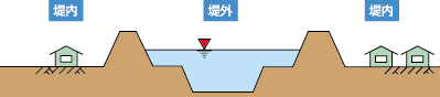 なぜ、私たちの生活している場所(川の外)を「内」、堤防の向こう側(川の中)を「外」というのでしょうか。それは、洪水の際には、人々は堤防によって流れてくる水から守られており、その人々がいる場所が内側になる、という考えからといわれています。 また、河川の氾濫の際、堤内の土地が浸水した場合、その水を取り除くことを「内水排除」といいます。 |