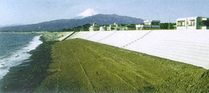 また、一方富士川からの供給土砂の減少や港湾施設等による沿岸漂砂の遮断等により、昭和30年代後半から海岸侵食が進行しています。このため、海岸堤防や離岸堤等の整備や養浜を行っています。 |