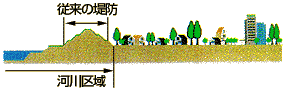 後背地に人口、資産等が高密度に集積した低平地を抱える大河川において、万一、計画規模を上回る洪水が発生しても堤防の破堤に伴う壊滅的な被害の発生が回避できるよう、越水や長時間の浸透にも耐えられる傾斜が緩く幅が広い堤防をスーパー堤防といいます。