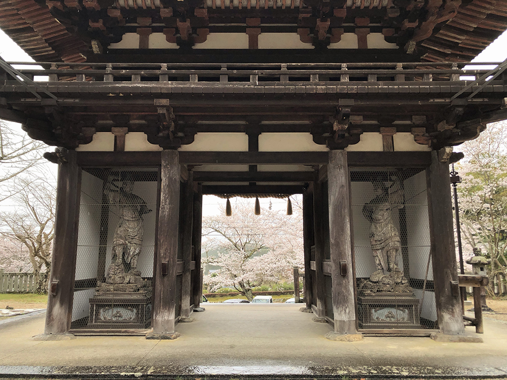 楼門の裏側から、楼門とその前の桜が収まるように撮影します。紅葉の季節は、本堂と背後の山のもみじを収める構図も素敵です。