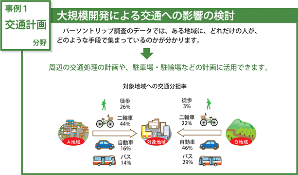 | PTデータの具体的活用法 | 開発地区への施設交通手段分担率を用いて、交通手段別発生集中交通量を算出します。 |
