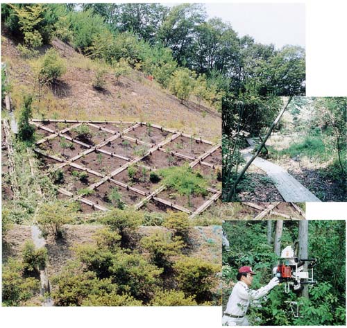 | 左 :ソダ枠工法による法面緑化試験プロット 右上:シデコブシの谷 右下:里山インタープリターズキャンプ「竹林・人工林の再生」より |