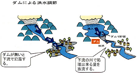 洪水調節 こうずいちょうせつ 洪水調節は、ダムに水を貯めて、下流の河道で処理できる量を流すものである。わが国の河川では、ヨーロッパ等の河川に比べると、川の長さが短く勾配が急なため、滝のように勢いよく流れる川が多いという特徴があり、降った雨が下流にすべて流れないようにダムによって流れる量を調節することが有効である。