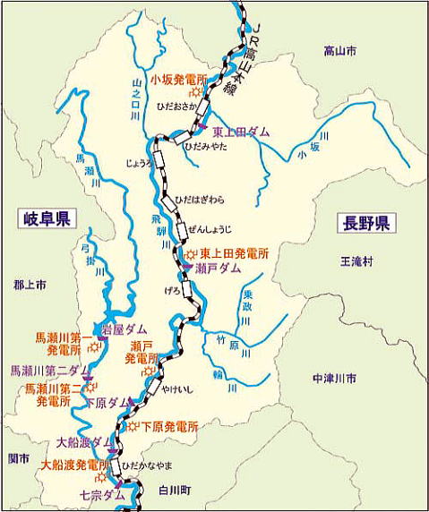 〔水力発電が盛んな飛騨川〕 河川勾配が急で、流量が多い飛騨川は、水力発電に適した川で、早い時期から多くの発電施設がつくられてきました。 |