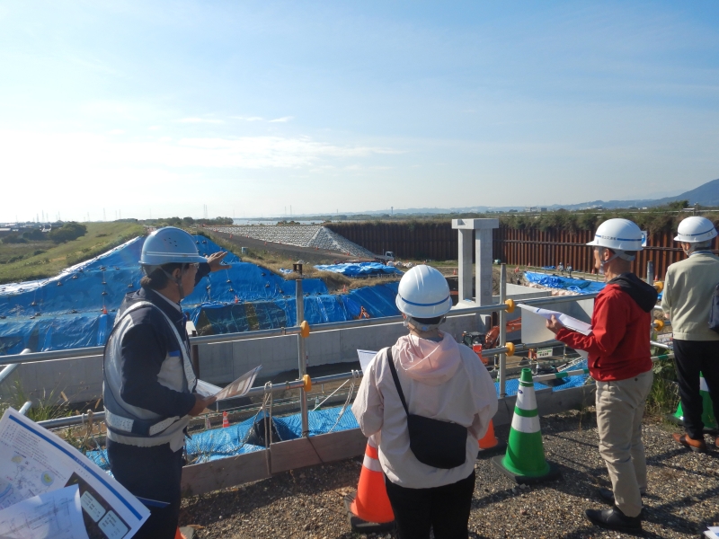 今年度は令和7年10月30日(木)に実施し、まず木曽川左岸の葛木樋管新築工事の現場を見学しました。その後、船頭平閘門に場所を移し、木曽三川下流部の治水の歴史や船頭平閘門の役割などについて学びました。 最後に木曽川下流河川事務所へ戻り、日ごろの河川愛護モニター活動で感じていることについて意見交換を行いました。