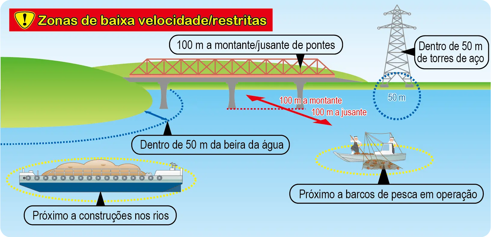 - Não encoste, atraque ou deixe as embarcações perto de comportas, canais e outras instalações de gestão do rio, e nem transite nas proximidades.