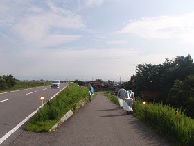 | 活動内成果 | 45Lゴミ袋×8袋 良い天気に恵まれました。 堤防上が県道であるため、相変わらず空きペットボトル・空き缶・お菓子の袋が多数捨てられていました。 私たちの活動で少しでも川や堤防がきれいになれば良いなと思いました。 |