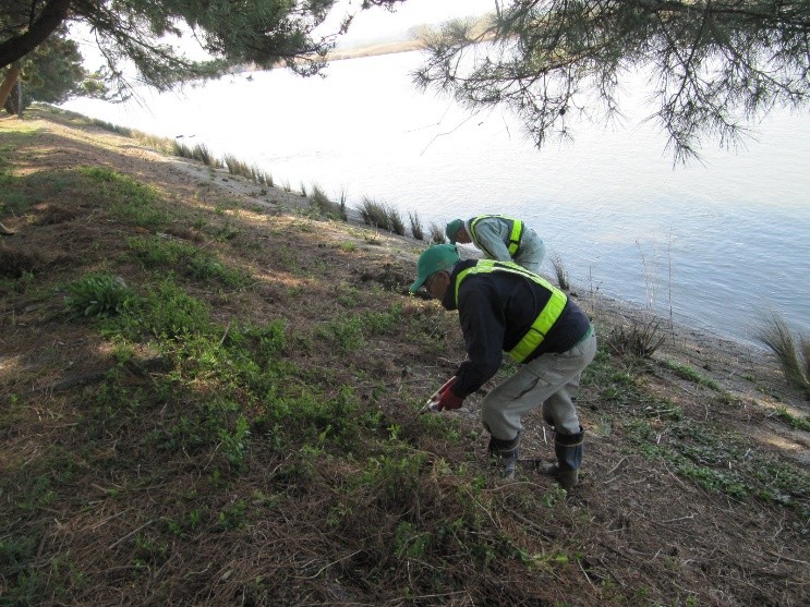 ![]() 草刈り機が無理なところは鋏で切断 |