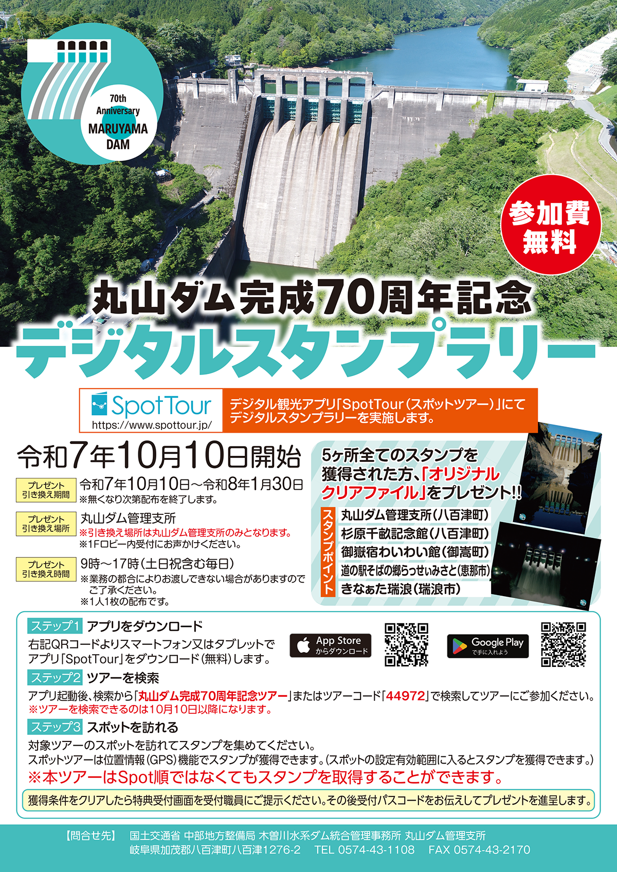 丸山ダム完成70周年を記念して、デジタル観光アプリ「SpotTour(スポットツアー)」を使用したデジタルスタンプラリーを実施します。