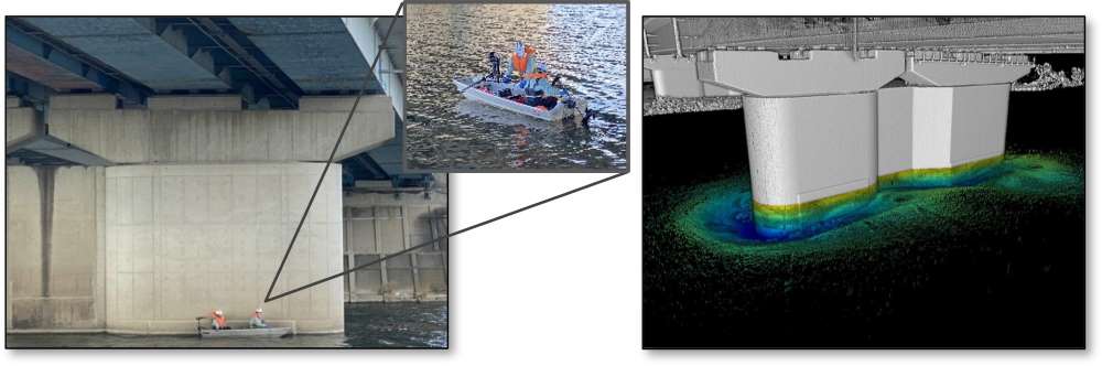 点検支援技術を活用することで、橋脚の洗掘※状況を可視化し、健全度を確認