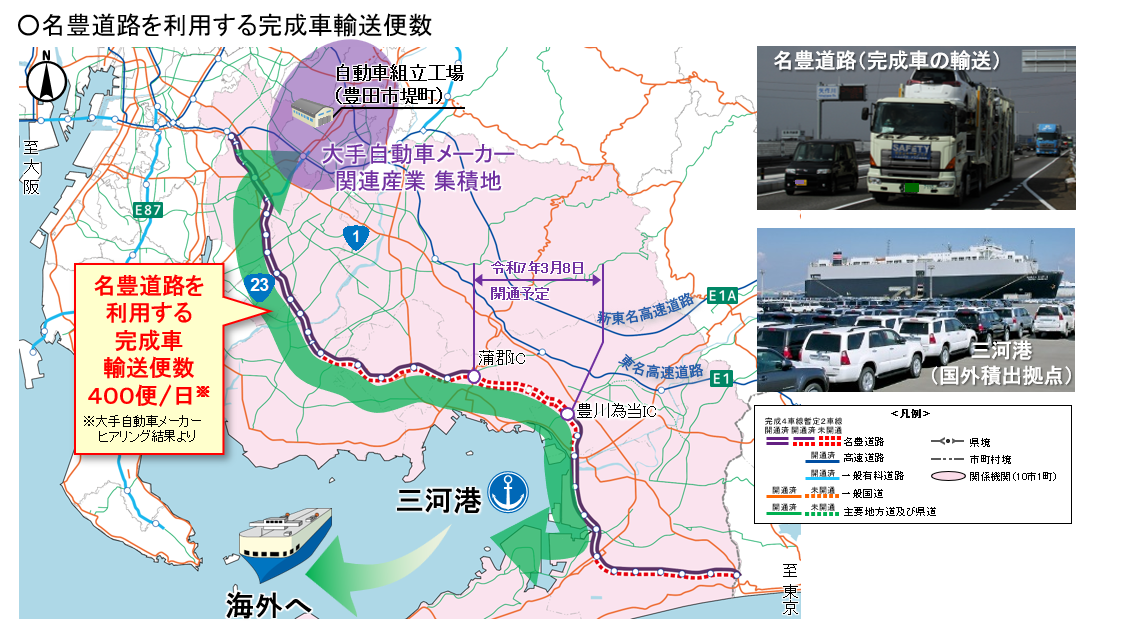 名豊道路が全線開通したことで、自動車組立工場から三河港までの完成自動車の輸送時間が短縮し、さらには輸送回数の増加等の効果が期待されます。