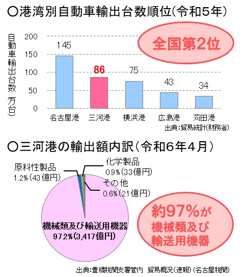 名豊道路に直結する三河港は、完成自動車を含む機械類及び輸送用機器が輸出額の約97%を占め、完成自動車の輸出台数が全国第2位と、全国を代表する完成自動車の輸出港です。