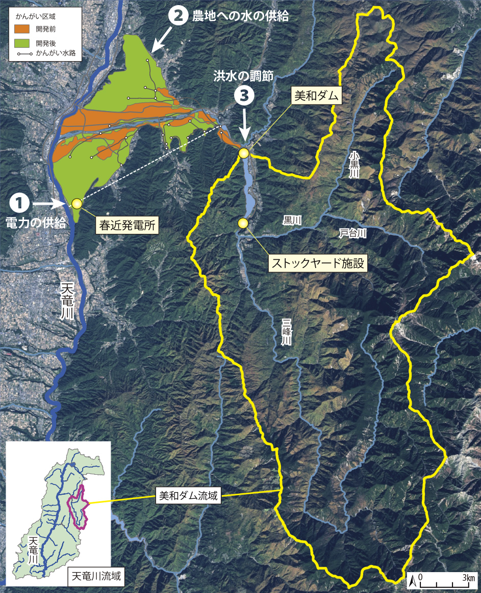 美和ダムは「治水」「かんがい」「発電」を目的とする多目的ダムで、天竜川流域の安全及び発展に大きく貢献し、完成から今日まで洪水被害の軽減に寄与しています。