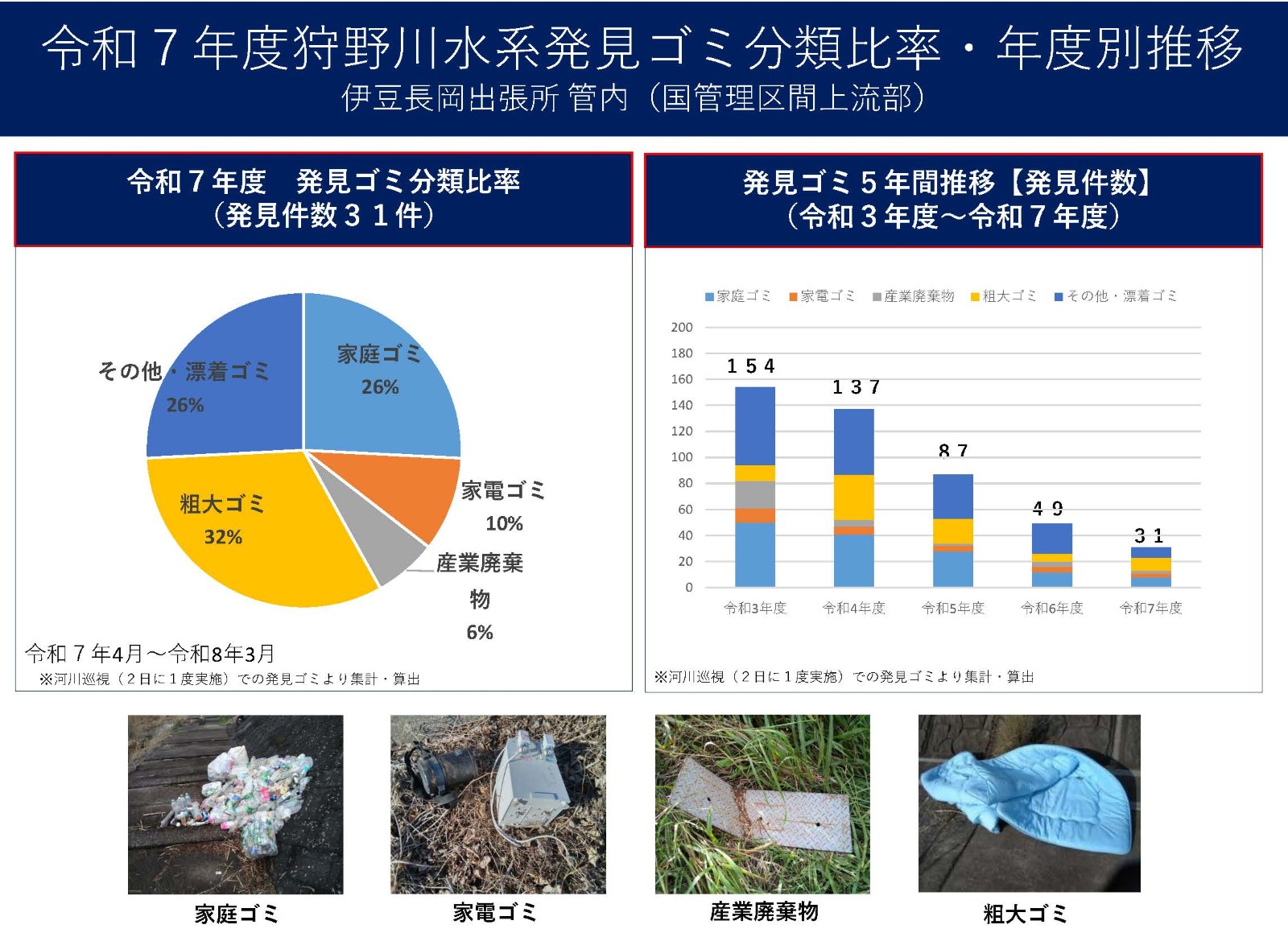 ゴミの不法投棄は狩野川の景観を損なうばかりか、水質を汚染する深刻な環境問題につながります。