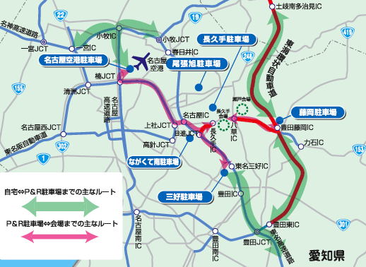 - 東海環状道などを利用して会場周辺のパーク&ライド(P&R)※駐車場に駐車し、そこでシャトルバスに乗り換えてもらうことで、マイカーの交通量がおさえられ、混雑緩和に大きく貢献しました。