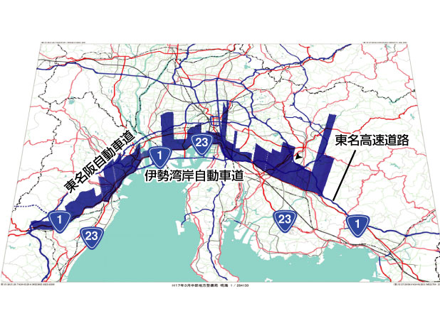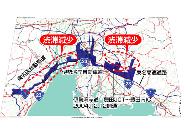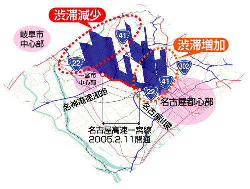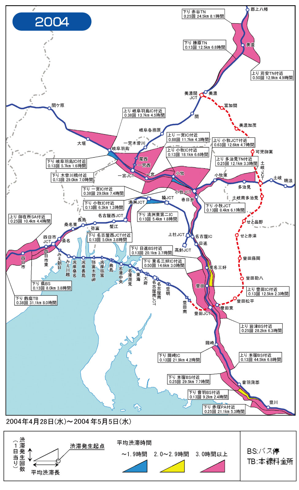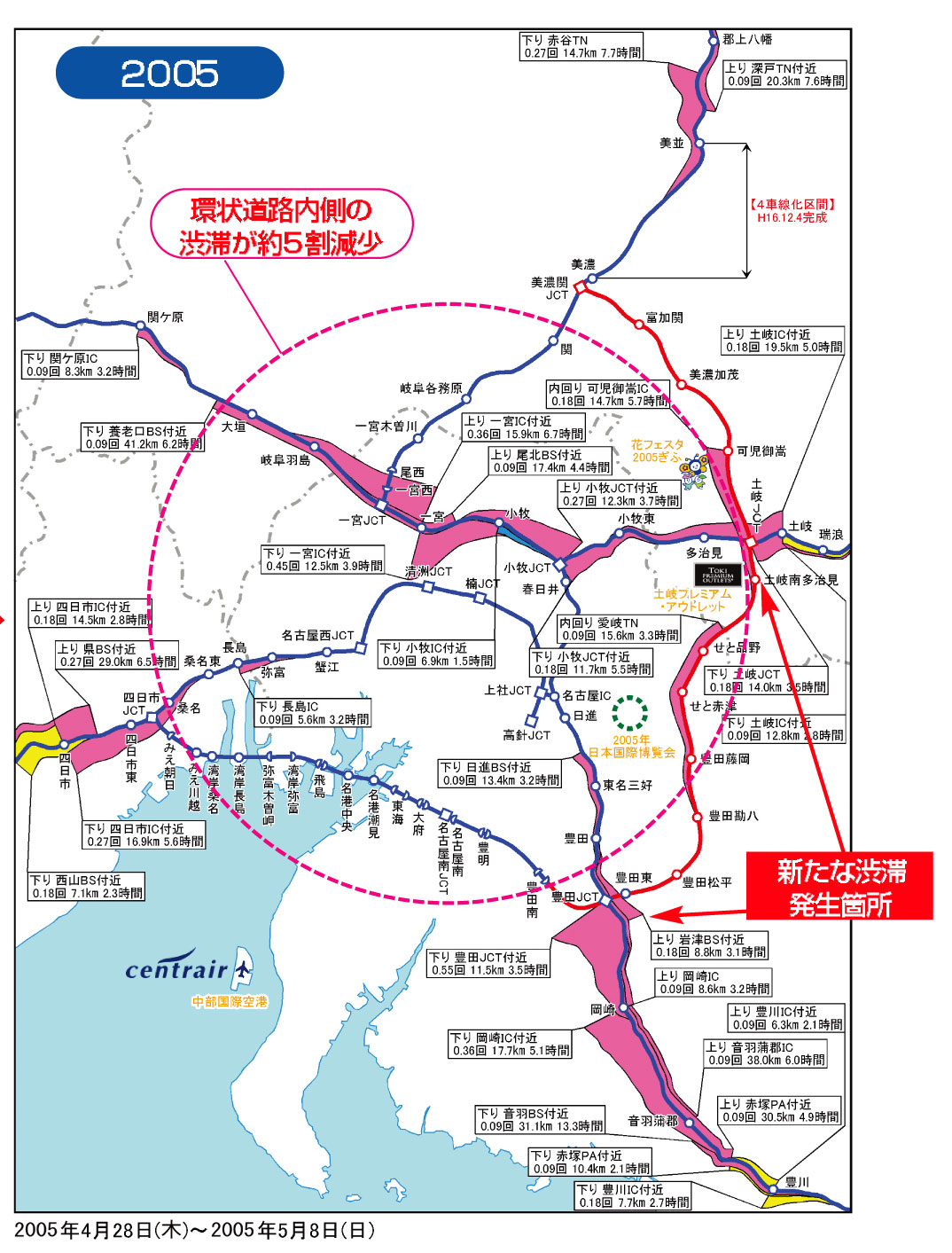 ![]() ※渋滞:渋滞長[km]×渋滞時間[時間]×渋滞回数[回]÷期間[日数]を渋滞量と定義し、2004年GW期間と2005年GW期間の渋滞量を比較 |