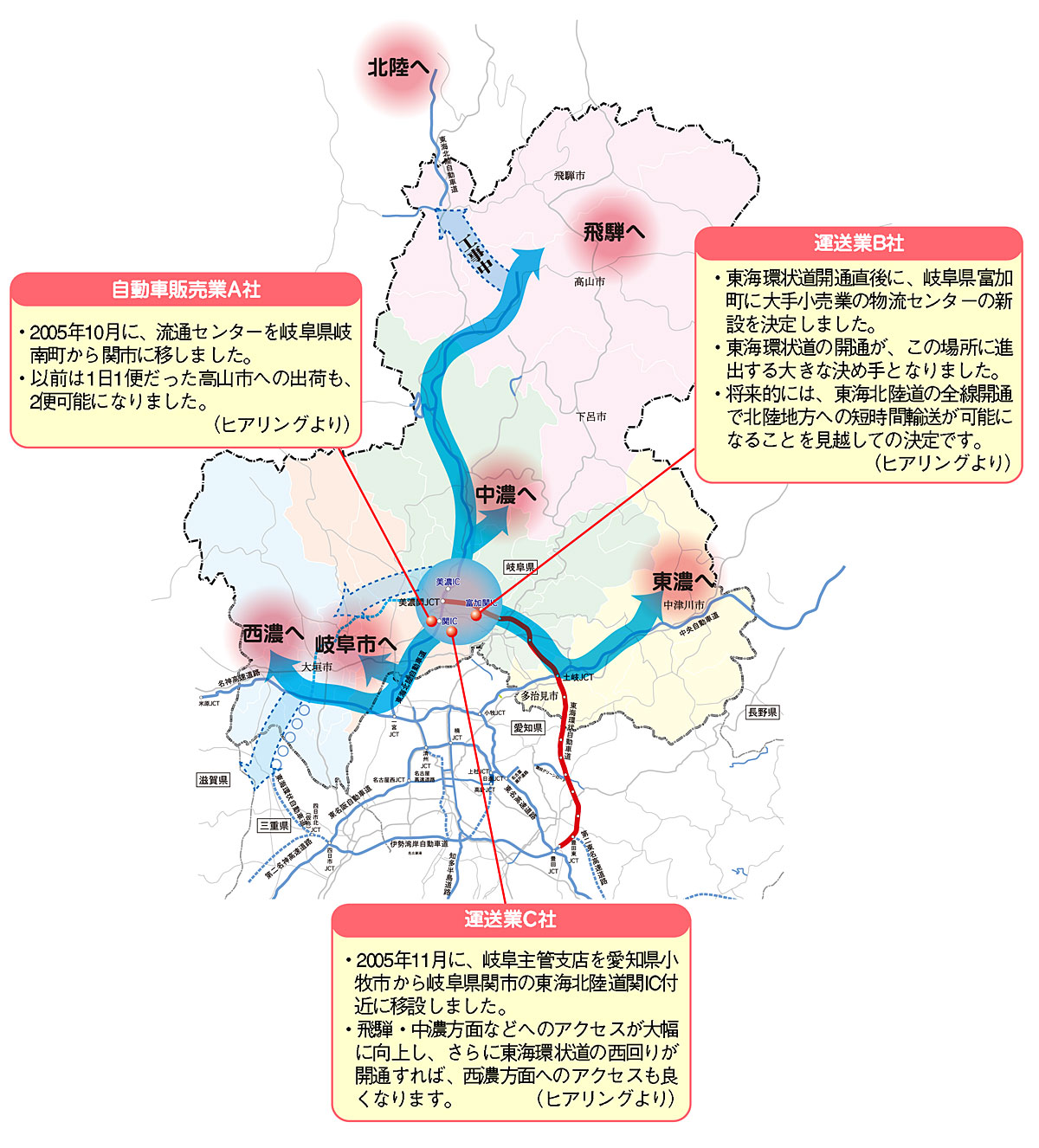 (2)暮らしと産業を支える 2)ものづくりと物流を支える ●美濃・関周辺から各地へのアクセスが向上!