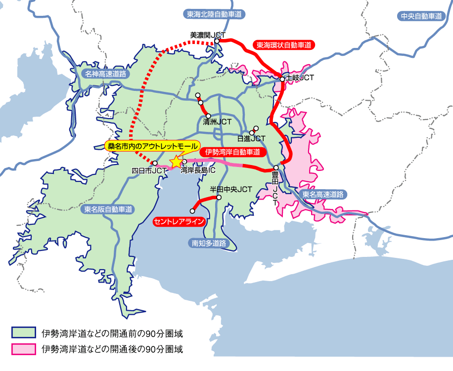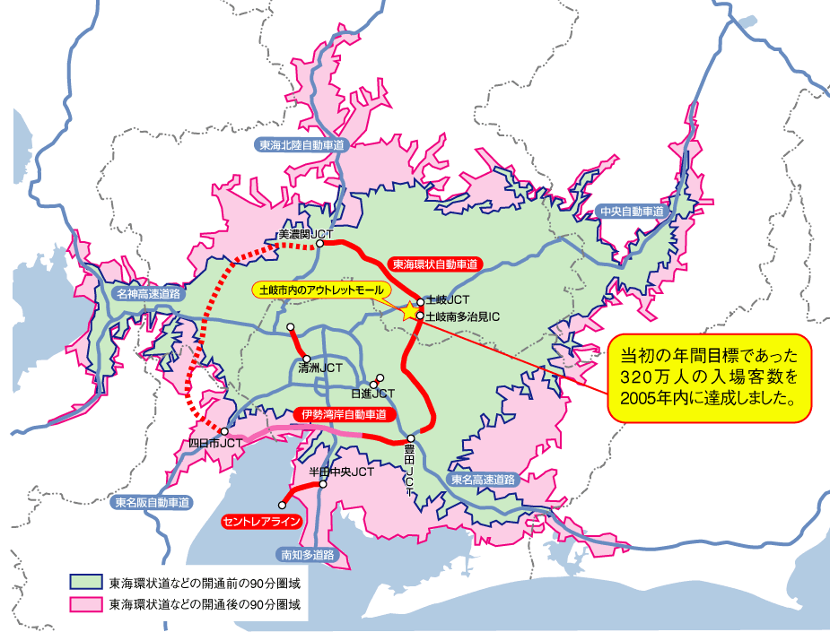 ● 買い物・レジャーの範囲が拡大! 東海環状道や伊勢湾岸道などの開通によって、買い物やレジャーに出かける範囲が広がっています。ここでは、その代表的な事例をご紹介します。
