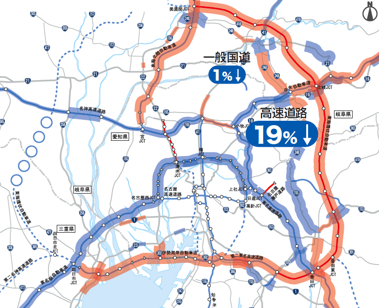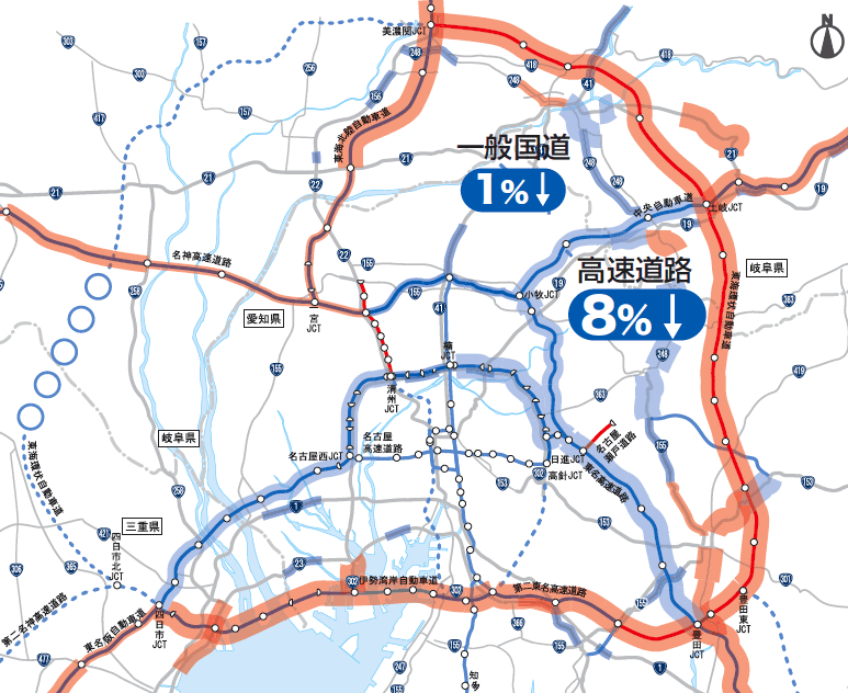 その結果、名古屋周辺では交通量が広い範囲で減少し
