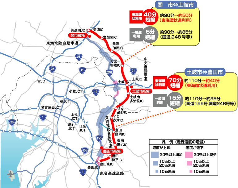 東海環状道に並行する国道でも、交通量が減って速度が上昇しました