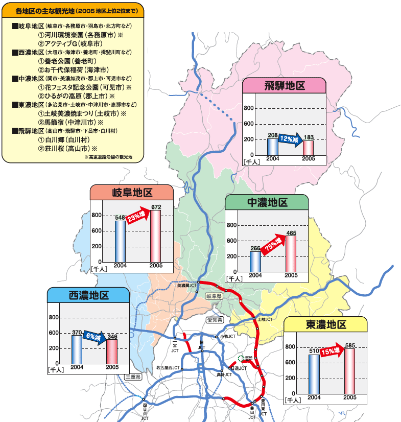 - 東海環状道の整備により、その沿線の岐阜県岐阜・中濃・東濃の各地区では、ゴールデンウィーク期間中の観光客が大幅に増加しました※。