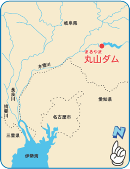 現在の丸山ダムがある木曽川は、長野県木曽郡木祖村鉢盛山(標高2,446m)を源に、長野・岐阜・愛知・三重の4県を通り、いくつかの支川を集めて、伊勢湾に注ぐ流域面積5,275k㎡、流路延長229kmの大河川です。丸山ダムは、木曽川の河口より約90km上流にあって、木曽川の流域面積の約半分を占めています。