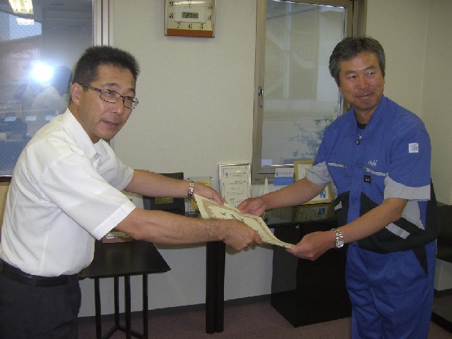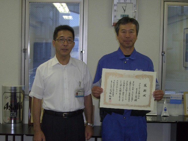 平成23年7月27日、アサヒビール(株)名古屋工場にて「平成23年度河川の美化・愛護等に顕著な功績のあった団体に対する表彰」として庄内川河川事務所長からの感謝状の贈呈を行いました。