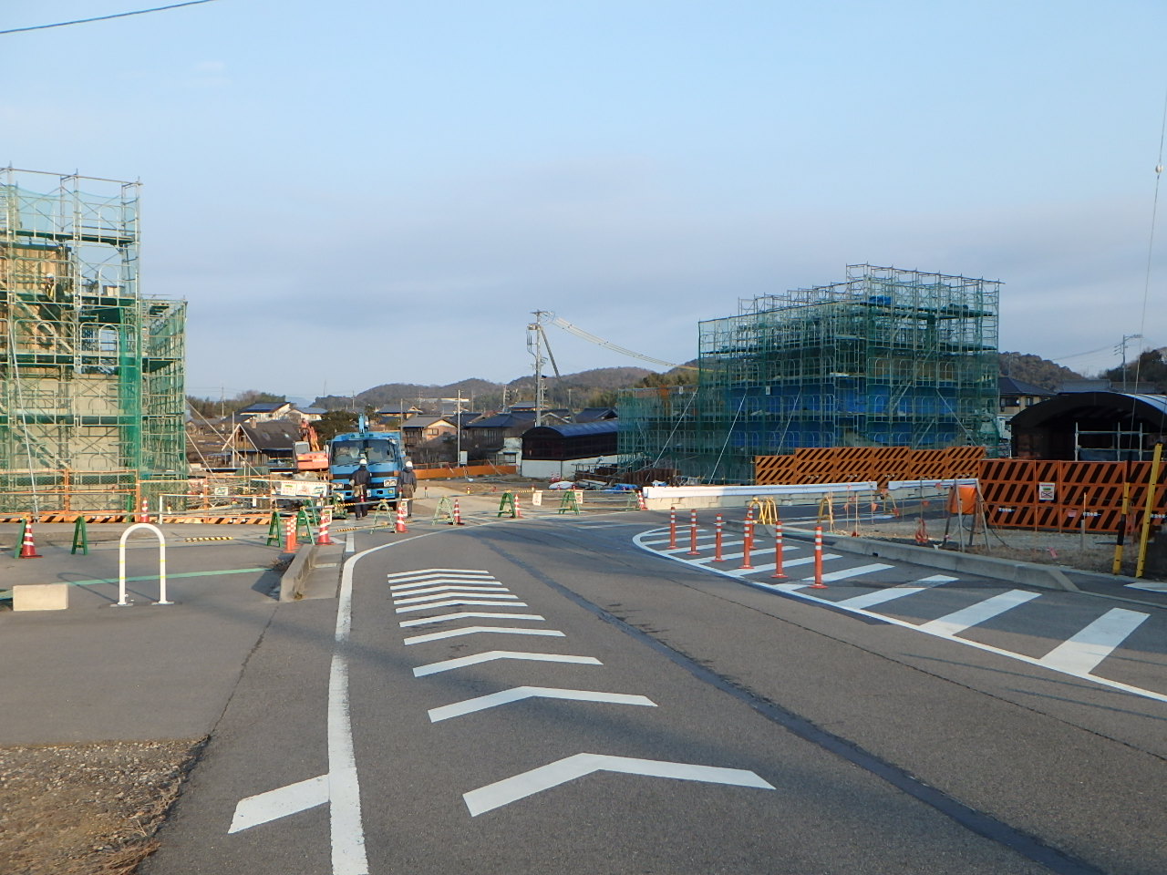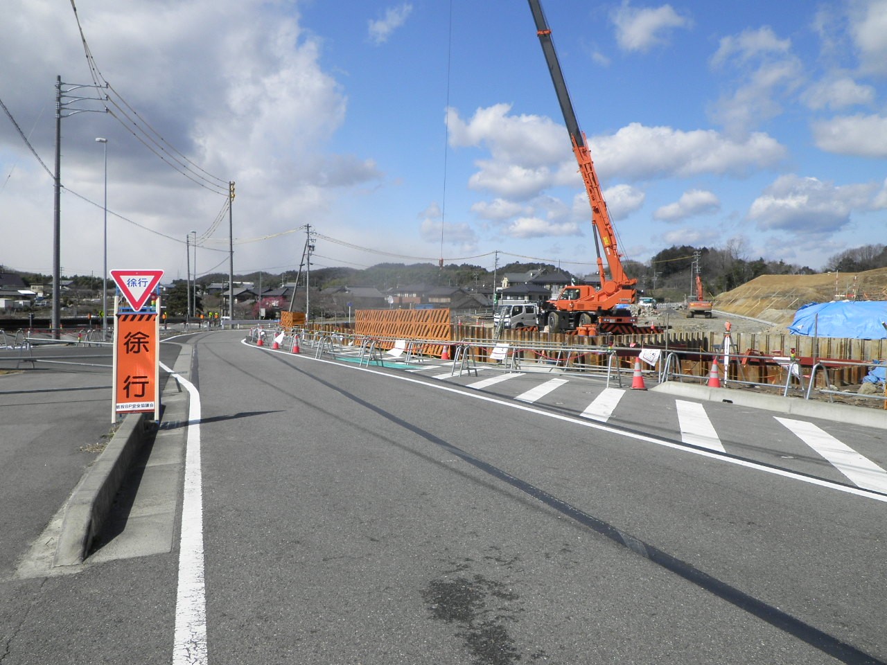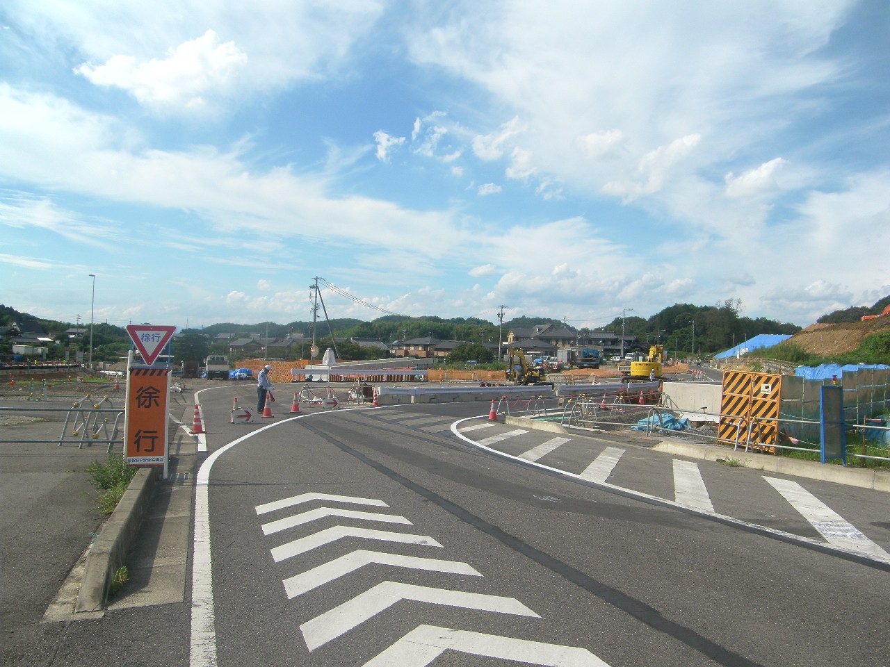 勝山IC橋交差点の工事を行っています。国道21号及び切廻し町道(通学路)について通行注意をお願いします。