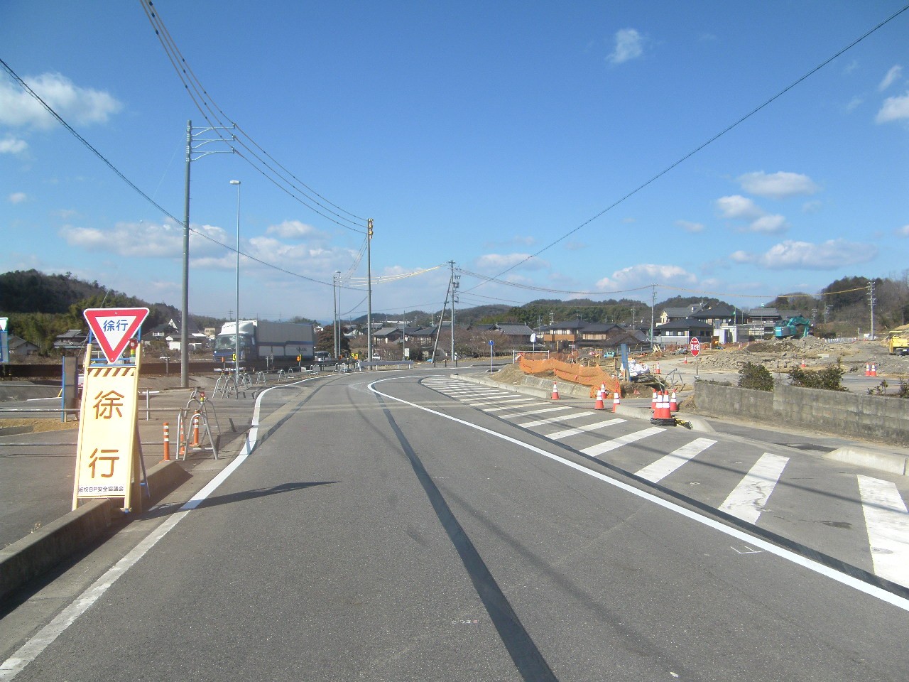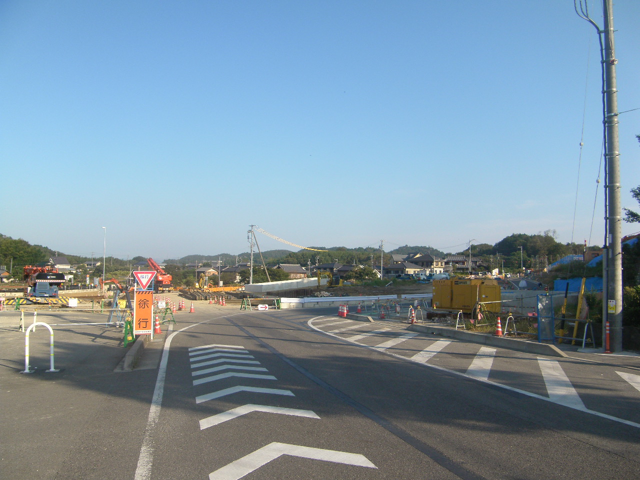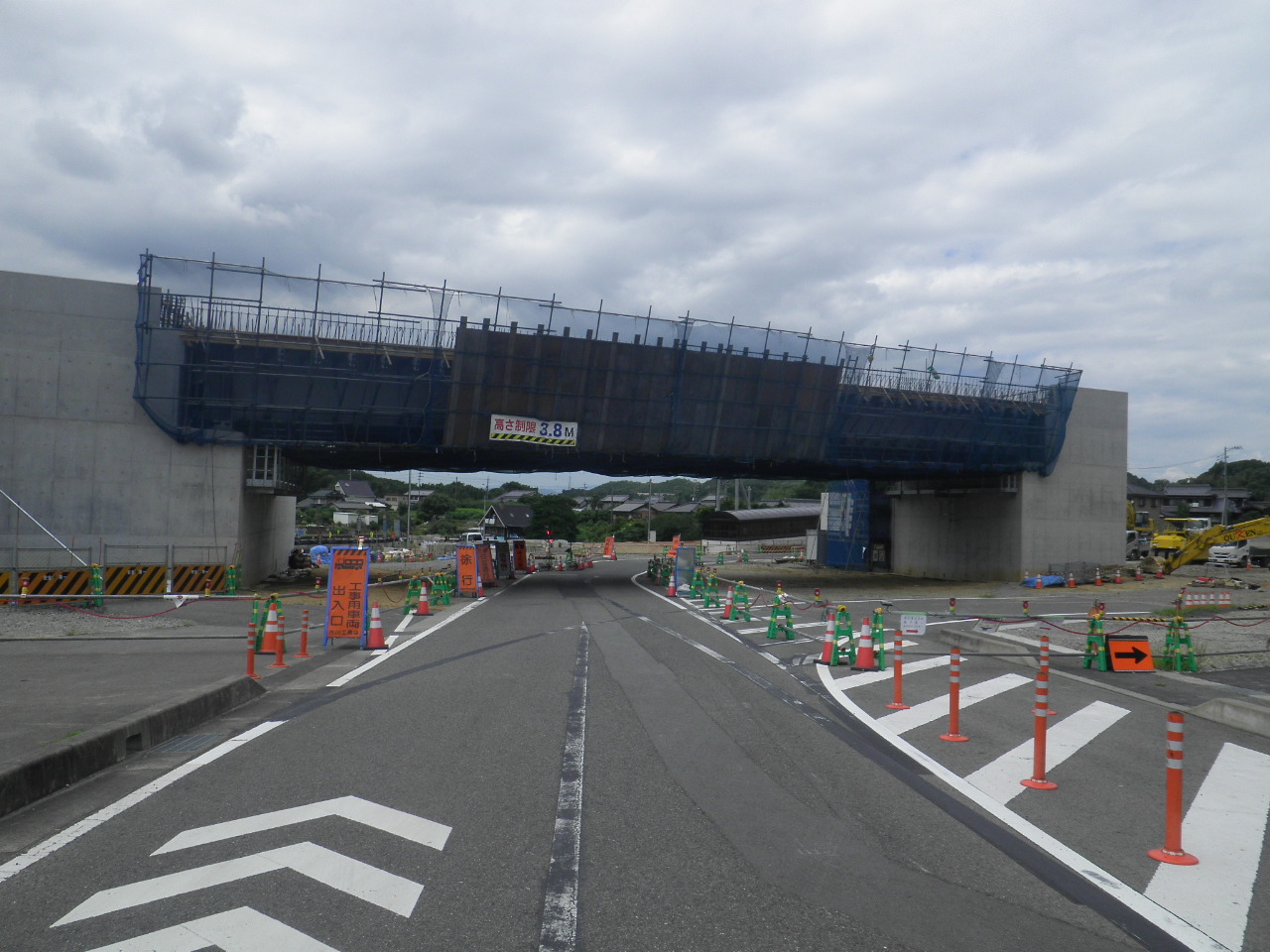 勝山IC橋交差点の工事を行っています。国道21号及び切廻し町道(通学路)について通行注意をお願いします。