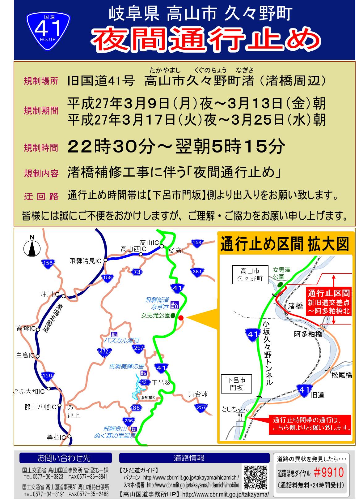 以下のとおり、国道41号(旧道)・高山市久々野町渚地内において、渚橋補修工事のため、夜間通行止めを行います。 ■規制期間:平成27年3月9日(月)夜〜3月13日(金)朝 平成27年3月17日(火)夜〜3月25日(水)朝 ■規制時間:22時30分〜翌日5時15分 ■規制内容:渚橋補修工事に伴う「夜間通行止め」 ■迂回路:通行止め時間帯は【下呂市門坂】側より出入りを お願い致します。(下図参照)